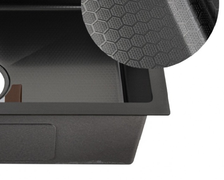 • Уникальный рисунок «Соты» создает на поверхности мойки прочный защитный слой с повышенной стойкостью к царапинам и механическим воздействиям. Шестигранная структура эффективно маскирует возможные микро-повреждения и упрощает ежедневный уход, препятствуя распространению воды и разводов. Благодаря увеличенной жесткости поверхности, мойка сохраняет идеальный внешний вид даже при интенсивной эксплуатации.