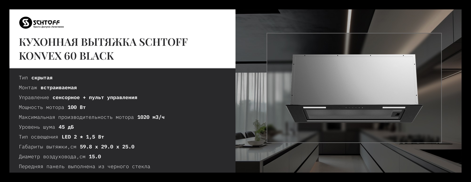 Полновстраиваемая вытяжка Konvex 60 Black — это технологичное решение для безупречной кухни. Она полностью интегрируется в гарнитур, создавая единую гладкую поверхность без выступающих элементов. Инновационная система шумоподавления обеспечивает тихую работу, сохраняя комфортную атмосферу. Сдержанный дизайн и чёрный цвет гармонично сочетаются с любым стилем — от классики до минимализма. Эта модель сочетает мощную производительность, эстетическую гармонию и акустический комфорт, делая кухню совершенным пространством.