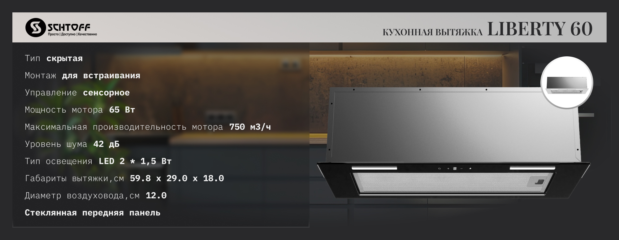 Вытяжка — неотъемлемая часть любой кухни, обеспечивающая свежий воздух и комфорт во время приготовления пищи. А наша полновстраиваемая вытяжка — это идеальное решение для тех, кто хочет сохранить гармонию и стиль! Управление вытяжкой сенсорное, позволяет вам выбирать наиболее удобный режим работы. А благодаря освещению LED, вы всегда будете иметь отличную видимость во время приготовления пищи. При изготовлении вытяжки используются только самые современные технологии и материалы, чтобы обеспечить максимальную эффективность работы и долгий срок службы. Стеклянная рамка!