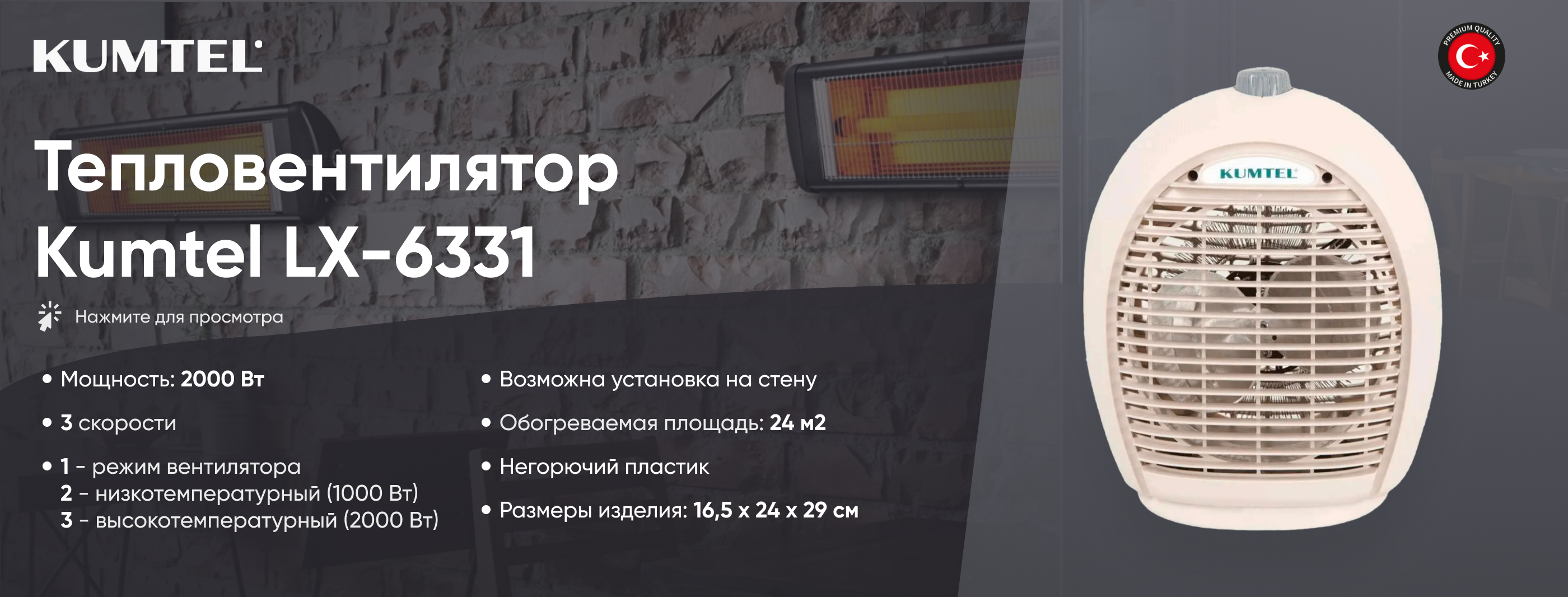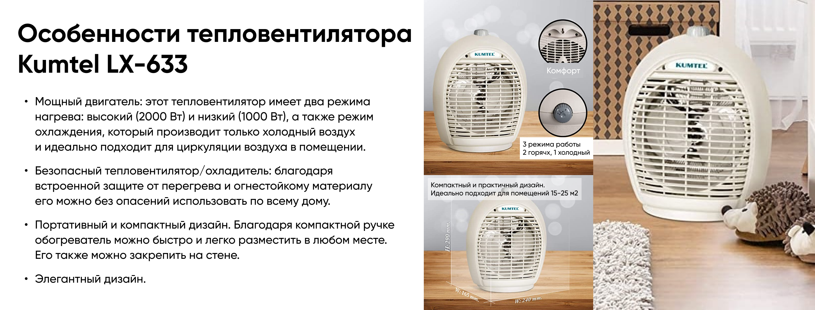 Скорости: 3 1- режим вентилятора, 2- низкотемпературный (1000 Вт), 3- высокотемпературный (2000 Вт)