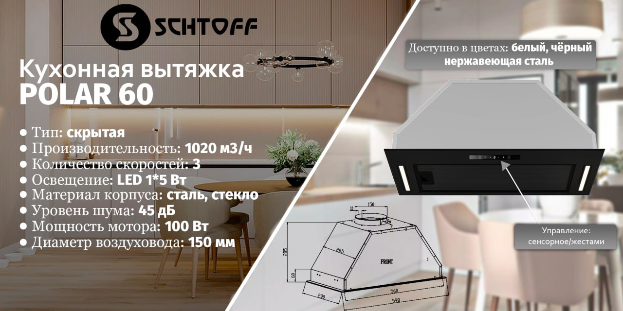 Полновстраиваемая вытяжка – это гарантия свежего, чистого воздуха в вашей кухне. Она эффективно удаляет пары и запахи, которые могут возникать при готовке, делая ваше пребывание в кухне более комфортным и приятным. Вытяжка легко встраивается в уже существующую мебель, не нарушая общей эстетики интерьера. Вытяжка оснащена удобным продублированным управлением (сенсорным/бесконтактным), которое позволяет легко настроить все необходимые параметры работы.