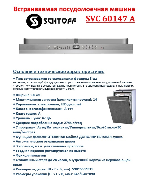 Встраиваемая посудомоечная машина Schtoff – это незаменимое устройство для современной кухни. Она обладает рядом преимуществ, среди которых можно выделить высокую функциональность и легкость использования. Скользящий фасад облегчает доступ к внутреннему пространству посудомоечной машины, что делает процесс загрузки и выгрузки посуды более комфортным. Автопрограммы делают использование посудомоечной машины более удобным и эффективным, позволяя пользователям выбирать оптимальный режим в зависимости от типа и степени загрязнения посуды. Удобной функцией является автооткрывание двери по окончании цикла мытья. Эта функция позволяет воздуху свободно циркулировать внутри машины, что способствует более быстрому высыханию посуды.