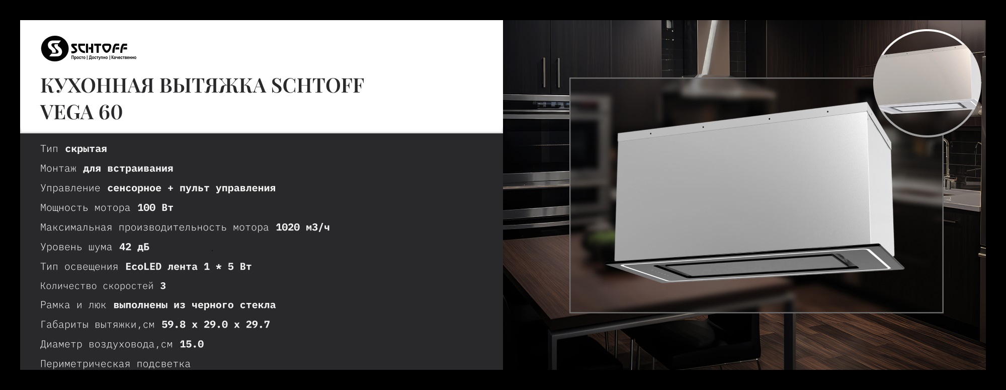Главное преимущество полновстраиваемой вытяжки — это возможность скрыть ее за фасадом кухонных шкафов. Таким образом, она не нарушает гармонию кухонного пространства и не привлекает излишнего внимания. Полновстраиваемая вытяжка — это превосходное решение для тех, кто стремится создать идеальную кухню с точки зрения функциональности и дизайна.